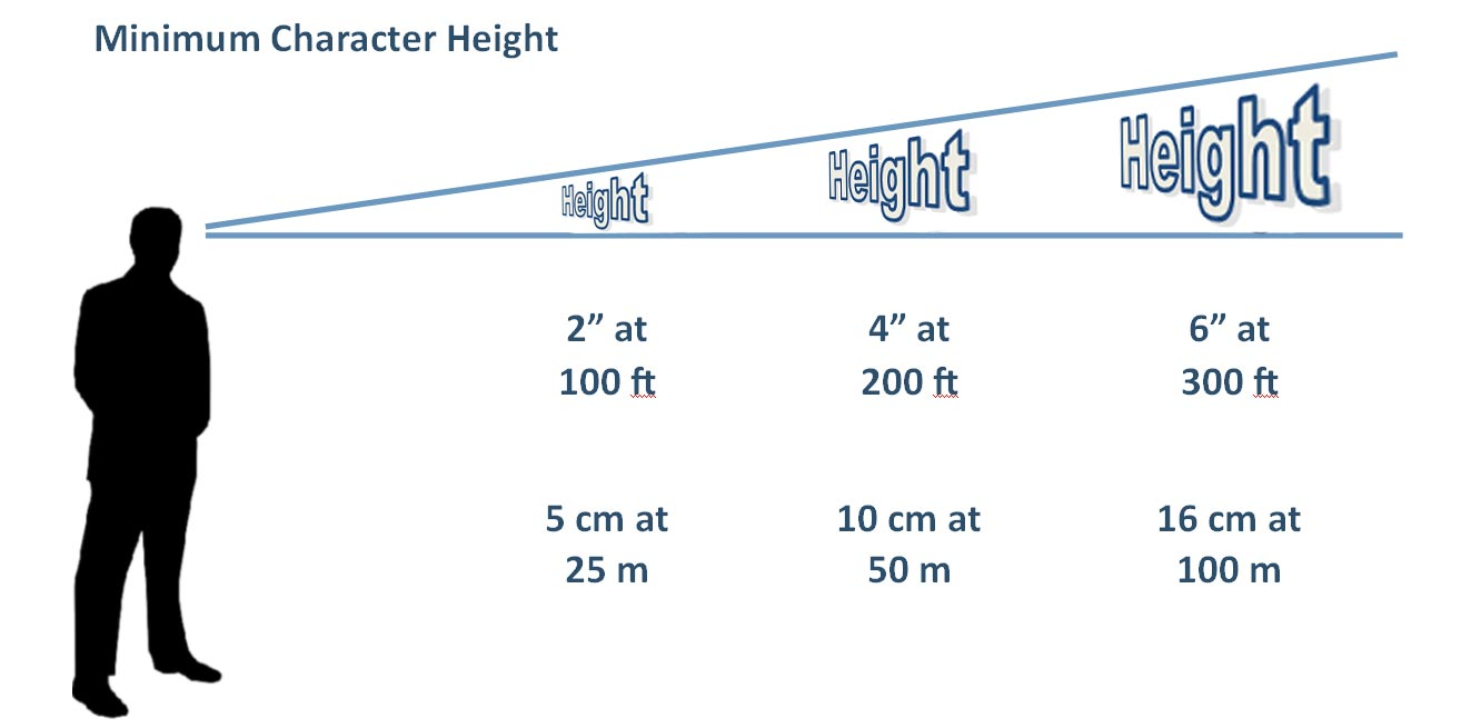 Важнейшим фактором светодиодных вывесок является расстояние просмотра. Если ваш знак будет виден с большого расстояния людьми, которые едут в быстро движущейся машине, вам понадобится большой размер символов, чтобы он был удобочитаемым. Как правило, в могиле вам нужно не менее 2 дюймов высоты персонажа на каждые 100 футов расстояния просмотра, чтобы его можно было прочитать. Для полноцветной вывески с поддержкой изображений и видео вам может потребоваться больший размер, чтобы лучше повлиять на зрителя.