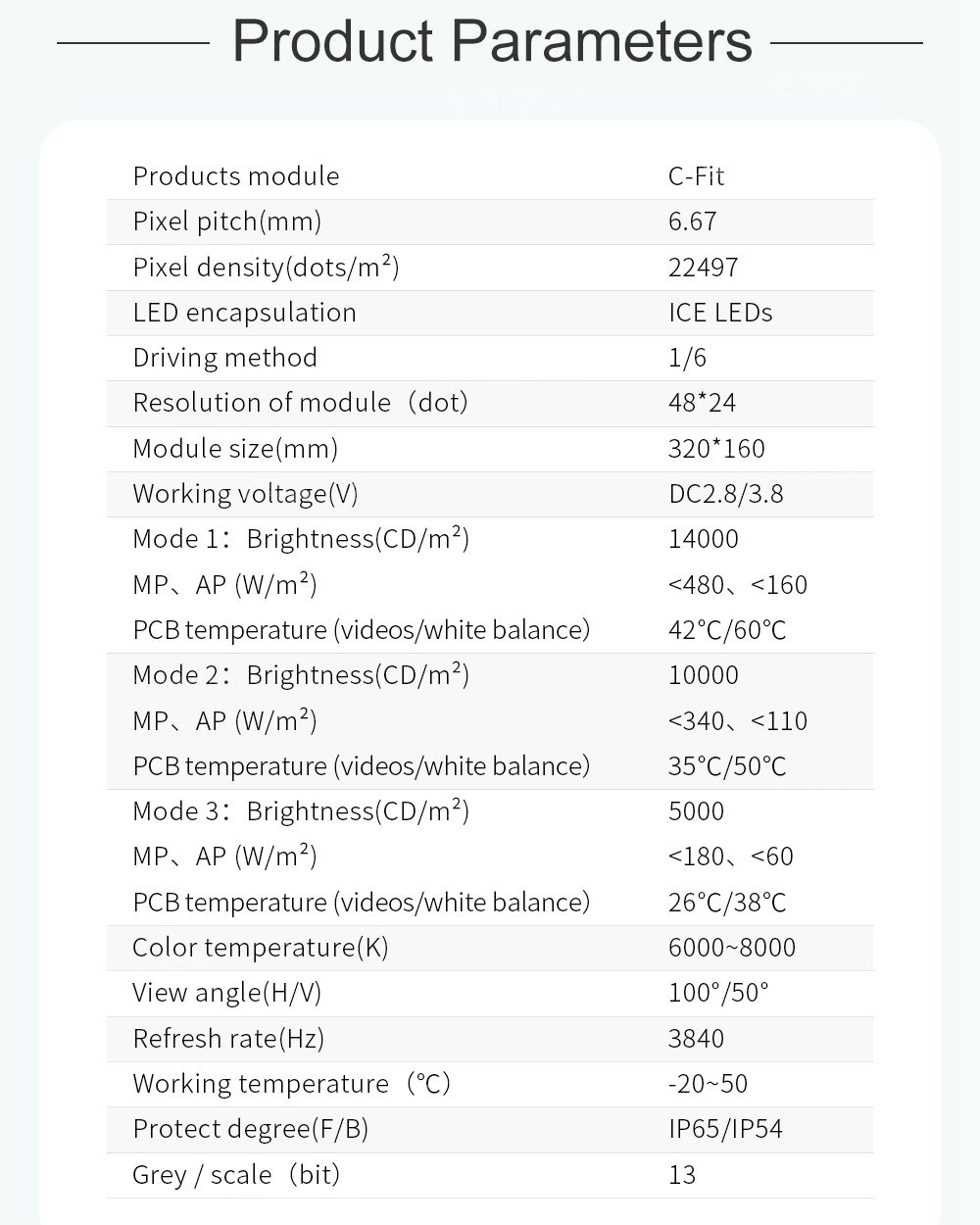 Шаг пикселя, разрешение, размер: 5 мм, 12*64 точки, 60*320 Цвет пикселя、 Пиксельный светодиод: 1R1G1B、 SMD1921 Рабочее напряжение, мощность модуля: 4,6 В постоянного тока, ≤ 10 Вт Вождение IC、Путь вождения Стандартная конфигурация: ICND2153、1/8 ХАБ: ХАБ75 Материал, Вес шкафа (кг/корпус): листовой алюминий, 15 кг/корпус. Разрешение, размер, количество модулей: 120*192 точки, 600*960*95 мм, 10X3. Плотность: 40000 точек/㎡ Баланс белого, Цветовая температура: 5000Кд/、6000-8000К. вид ангела, неплоскостность, интервал модуля по горизонтали/вертикали: 120°/120°, <0,2 мм, <0,2 мм Максимальная мощность/㎡、Средняя мощность/㎡: ≤560 Вт/㎡、≤170 Вт/㎡ Частота кадров, частота обновления, уровень серого: 60 Гц, 3840 Гц, 13 бит. Система управления、Система поддерживает CHIPSHOW,Windows XP,WIN 7 Рабочая температура. Степень защиты: ~20–50 ℃. Передняя/задняя панель: IP65/IP54.