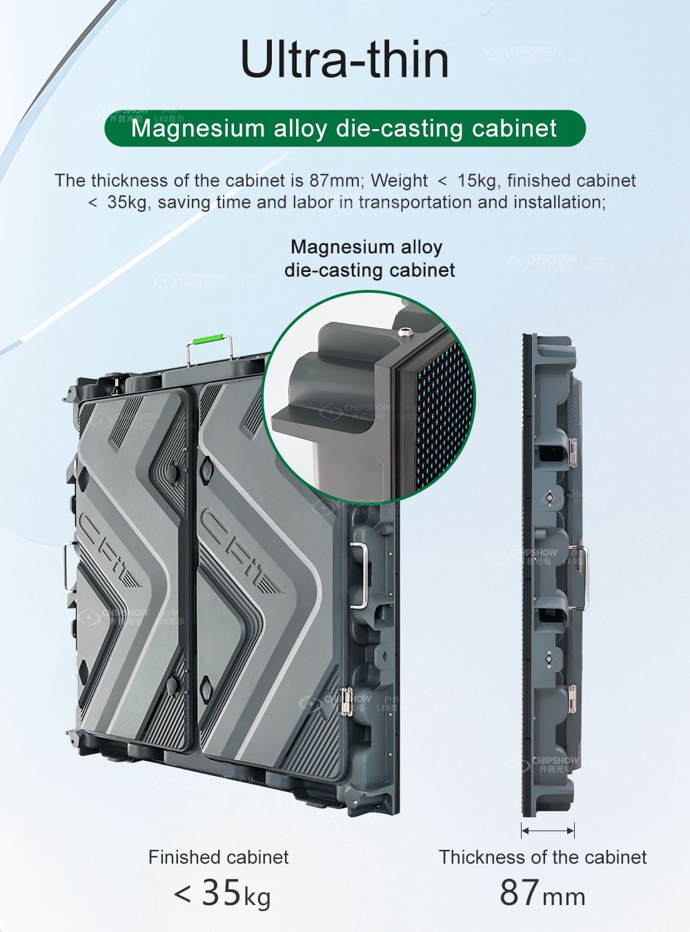 3 Ультратонкий: корпус изготовлен из магниевого сплава, литого под давлением (вес пустого корпуса: ¼15 кг, вес готового корпуса: ¼35 кг; толщина корпуса: 87 мм); это облегчает транспортировку и установку шкафов;