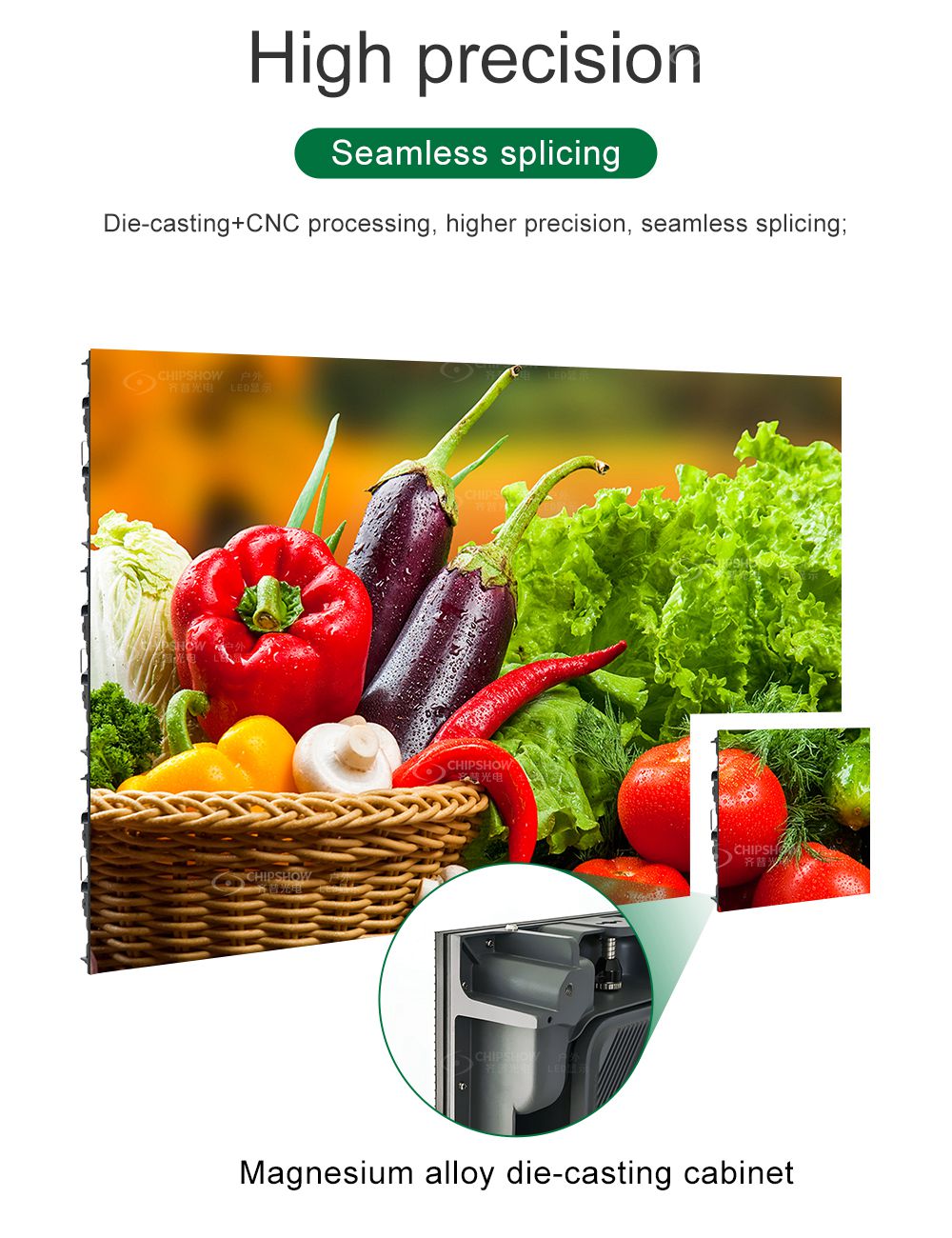 Функции: 1 Хорошая плоскостность: экран изготовлен из литого под давлением алюминиевого корпуса с допуском в пределах 0,1 мм; 2 Ультратонкий: литые алюминиевые шкафы на 20% тоньше и весят на 15 кг/м², чем железные шкафы, что помогает значительно снизить затраты на транспортировку и каркас; 3 Простота модернизации и замены: шкафы адаптированы к нашим модулям P2.5~P16; так что вам не придется менять шкафы для апгрейда, это сэкономит много рабочей силы и затрат на шкафы; 4. Несколько целей: Серия C-Fit широко используется в качестве решения для больших дисплеев в качестве экранов для наружной рекламы, экранов для аренды сцены и светодиодных экранов по периметру стадиона; серия C-Fit используется не только в качестве стационарных настенных экранов, но и в качестве наземных экранов для небольших мероприятий или помещений с низкими потолками; 5. Высокая яркость: яркость достигает 3700~4200 кд/㎡, поэтому экран может отображать четкое изображение даже при ярком освещении; 6 Медленное повышение температуры, эффективное рассеивание тепла: устройство рассеивания тепла изготовлено из алюминиево-магниевого сплава с отличной теплопроводностью; 7 Высокая экономическая эффективность: корпус со степенью защиты IP65 обеспечивает защиту от всех видов неблагоприятных погодных условий, таких как водяные струи, соляные брызги, соляная коррозия и ветровая эрозия; Высокая надежность 8: все модули используют технологию уплотнения и высококачественную медную проволоку;