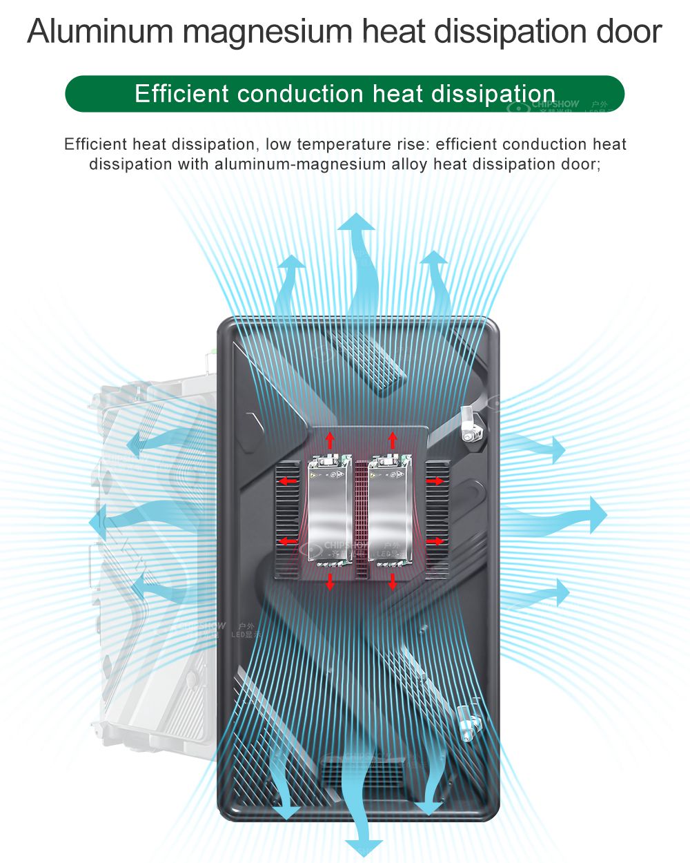 6 Высокоэффективный отвод тепла: собственная разработка системы отвода тепла гарантирует, что тепло в любом углу шкафа может быстро рассеиваться за счет удвоенного тока и отрицательного давления; это гарантирует, что светодиодный экран всегда сможет нормально работать без проблем с рассеиванием тепла¼