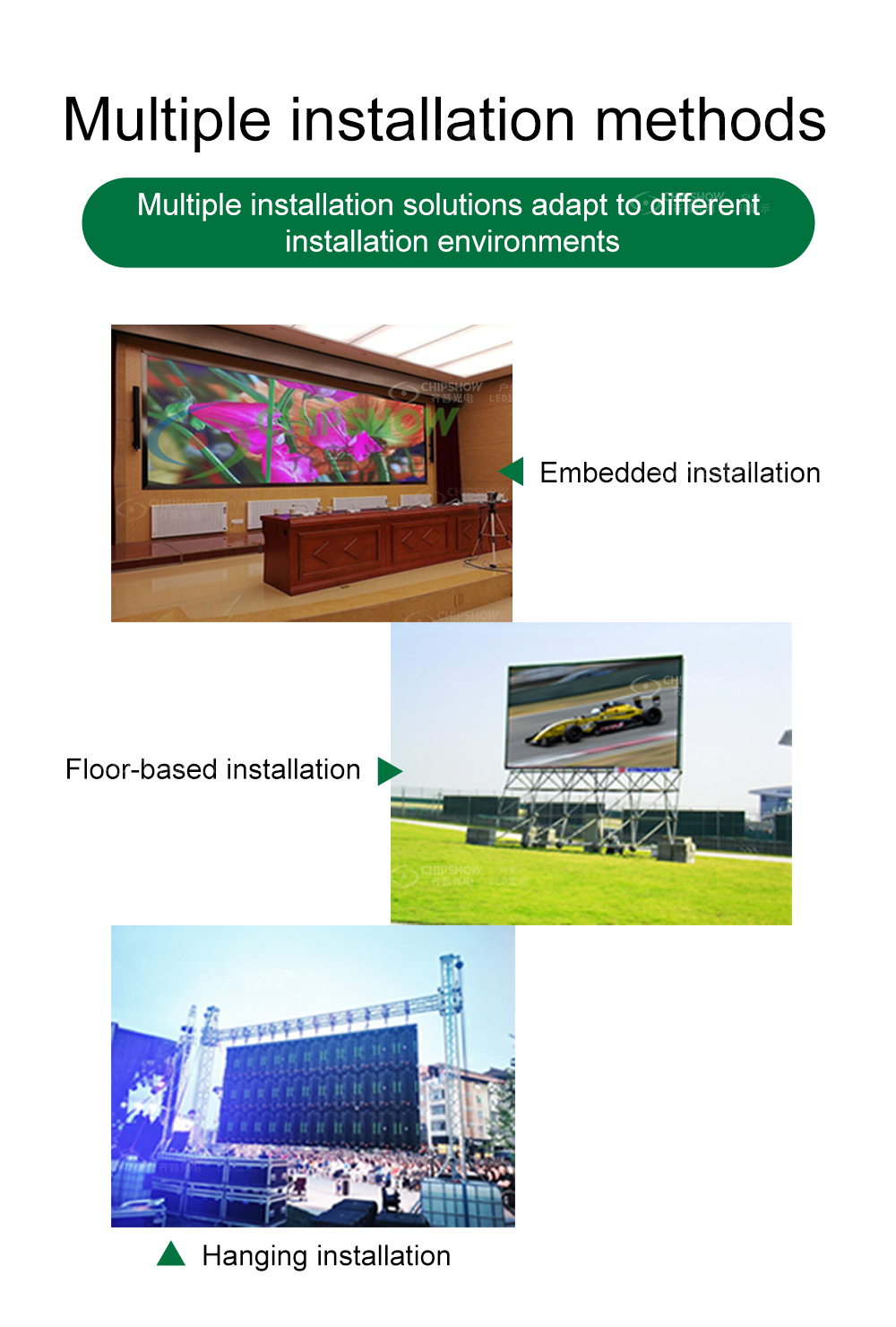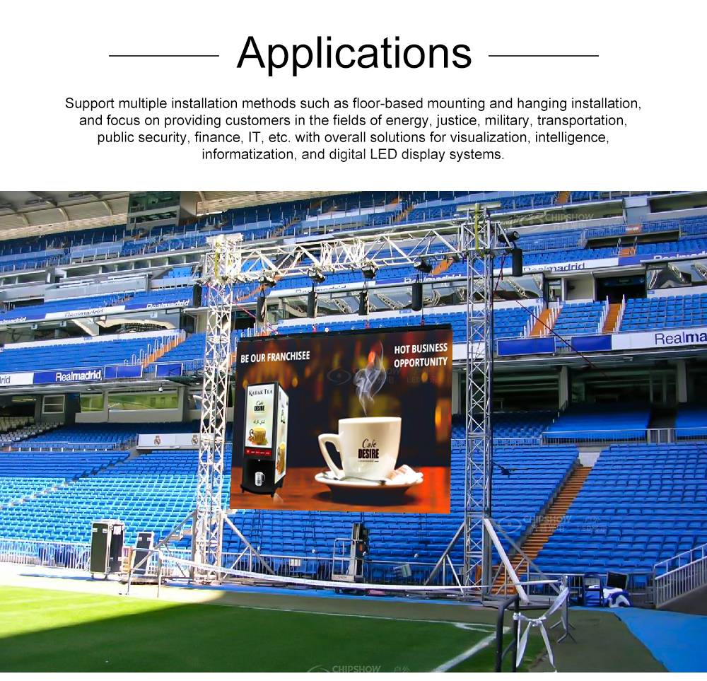 7. Многофункциональные приложения: поддержка нескольких методов установки, таких как напольная и подвесная установка, и сосредоточение внимания на предоставлении клиентам в областях энергетики, юстиции, военного дела, транспорта, общественной безопасности, финансов, информационных технологий и т. д. комплексных решений для визуализации. , разведки, информатизации и цифровых светодиодных систем отображения.
