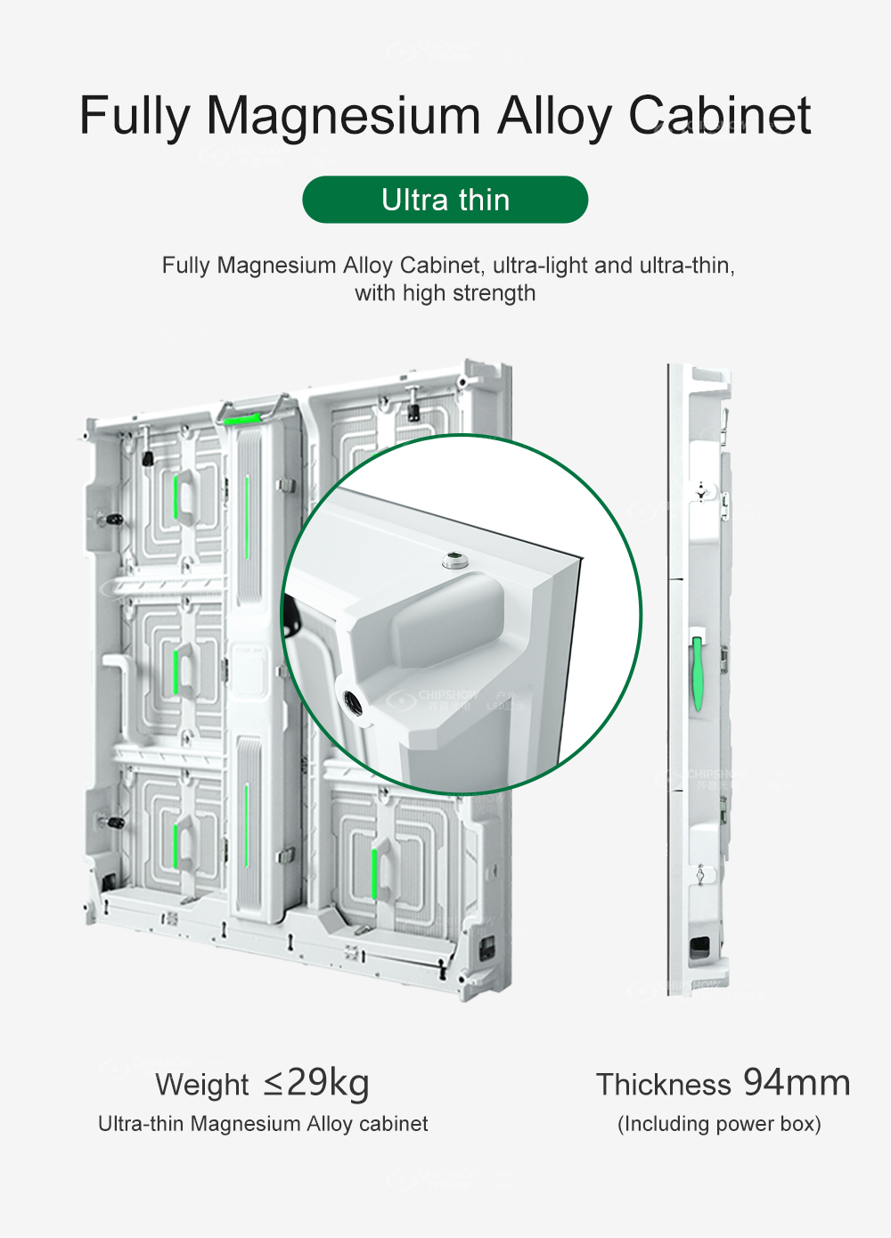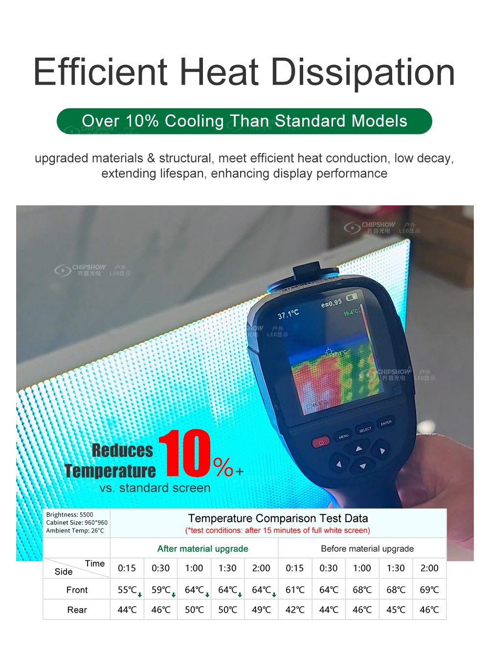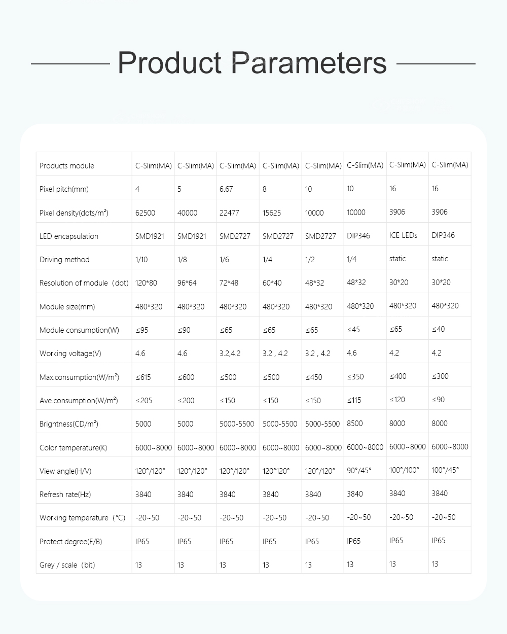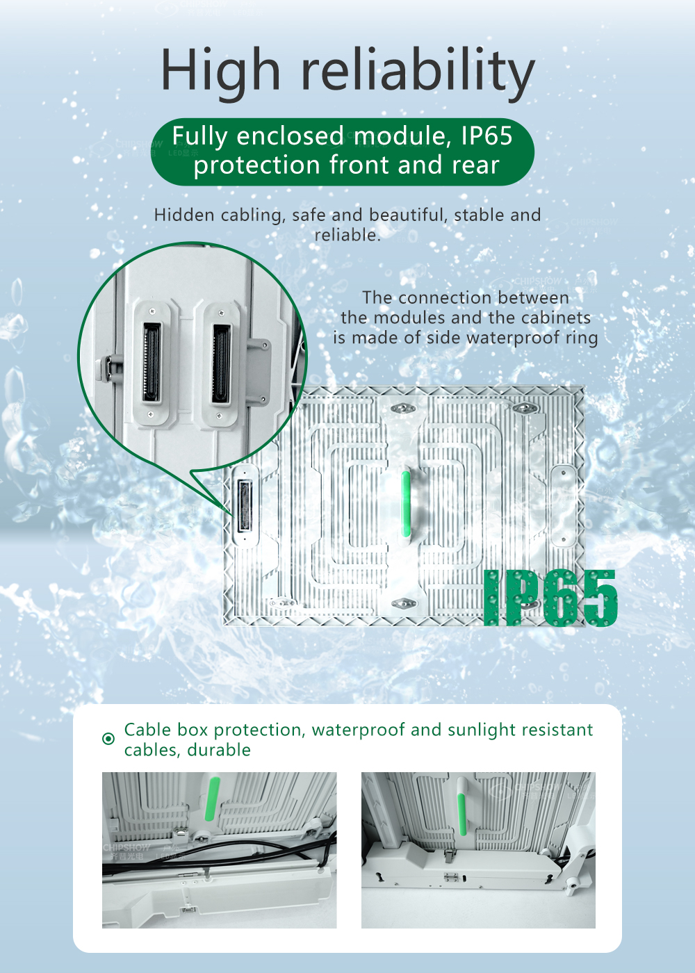 1. Низкое энергопотребление, низкий подъем температуры, энергосбережение, среднее энергопотребление ≤180 Вт/ ㎡ ; 2. Полностью закрытый модуль. Разборка и сборка модуля не требует использования винтов и может быть быстро разобрана. ; 3. Соединение модуля с коробкой осуществляется с помощью бокового водонепроницаемого кожаного кольца, обладающего высокой водонепроницаемостью. ; 4. Корпус полностью литой алюминиевый, сверхлегкий и тонкий; вес ≤29 кг, толщина ≤105 мм 5. Высокий уровень водонепроницаемости, весь корпус имеет класс защиты IP65. ; 6. Области применения: носители наружной рекламы, государственные и корпоративные проекты, культурный туризм, спортивные соревнования, продвижение имиджа, коммерческая недвижимость и т. д.
