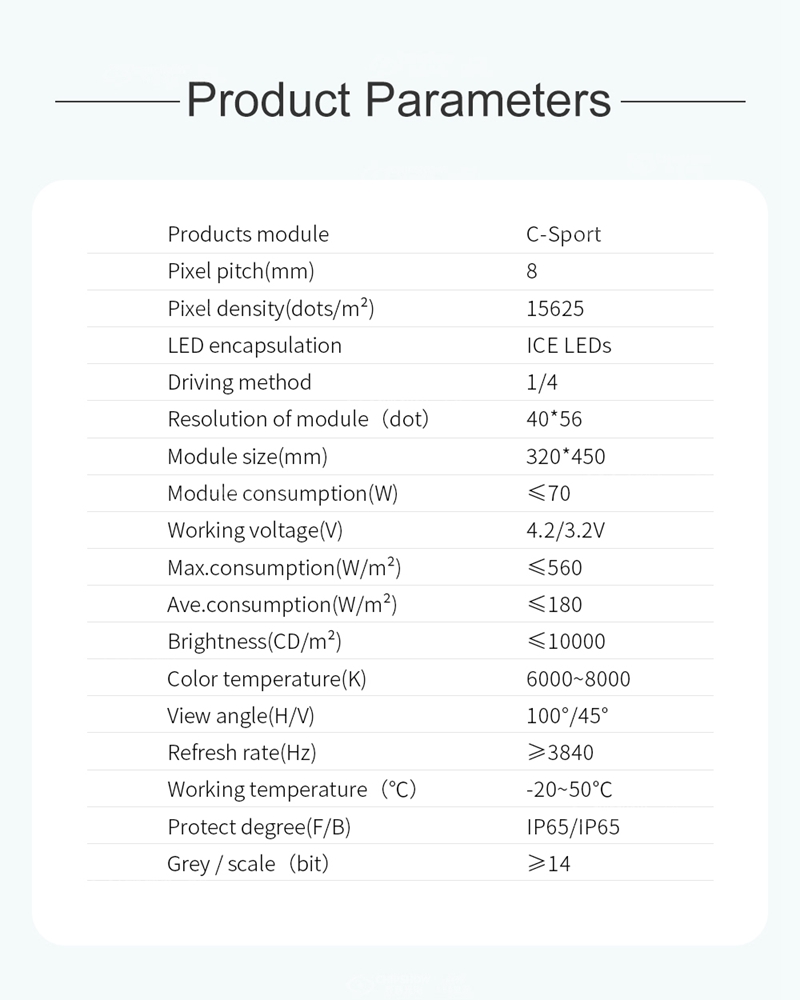 Светодиодный дисплей P8, P10 C-Fit-Sport использует технологию виртуальной замены. Виртуальную рекламу можно будет передавать в разные страны вместо реальной рекламы на стадионе. Преимущества: 1. Интеллектуальный светодиодный дисплей по периметру. 2. Технология виртуальной замены, работающая от ИК-светодиода. 3. Быстрая установка и конструкция шкафа для обслуживания. 4. Мягкая конструкция комплекта защиты для защиты игроков от вреда. 5. Система отвода тепла при отрицательном давлении дополнительно гарантирует надежность. 6. Доступен для удаленного мониторинга с помощью приложения .