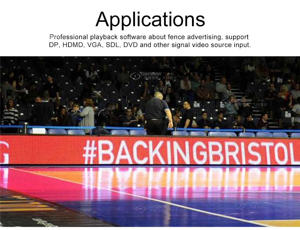 Светодиодные экраны по периметру стадиона C-Sport P8 широко используются для цифровой рекламы по периметру; Функции: 1. Каждый шкаф оснащен быстрыми замками слева и справа, а также регулируемым поворотным кронштейном на 90 градусов для удобства быстрой сборки дисплея по периметру; 2 Каждый экран поставляется с мягкими защитными подушками, мягкими масками светодиодного модуля, поэтому и спортсмены, и светодиодные экраны могут быть полностью защищены; 3. Алюминиевый блок питания не только имеет легкий вес, но и обладает отличными характеристиками рассеивания тепла; это эффективно замедляет процесс старения силовых модулей; 4. Каждый светодиодный модуль поддерживает фронтальное и заднее обслуживание, что упрощает эксплуатацию во время установки и последующего обслуживания; 5. Передняя и задняя часть шкафа пыленепроницаема и водонепроницаема, имеет уровень защиты IP65; 6 По сравнению с обычными светодиодными экранами серия Chipshow C-Sport является энергосберегающей – можно сэкономить около 1/3 энергопотребления; это значительно снижает эксплуатационные расходы;   7 Экран также поставляется с профессиональным программным обеспечением для рекламы по периметру, которое поддерживает различные источники видеовхода, такие как DP, HDMI, VGA, SDL и DVD;