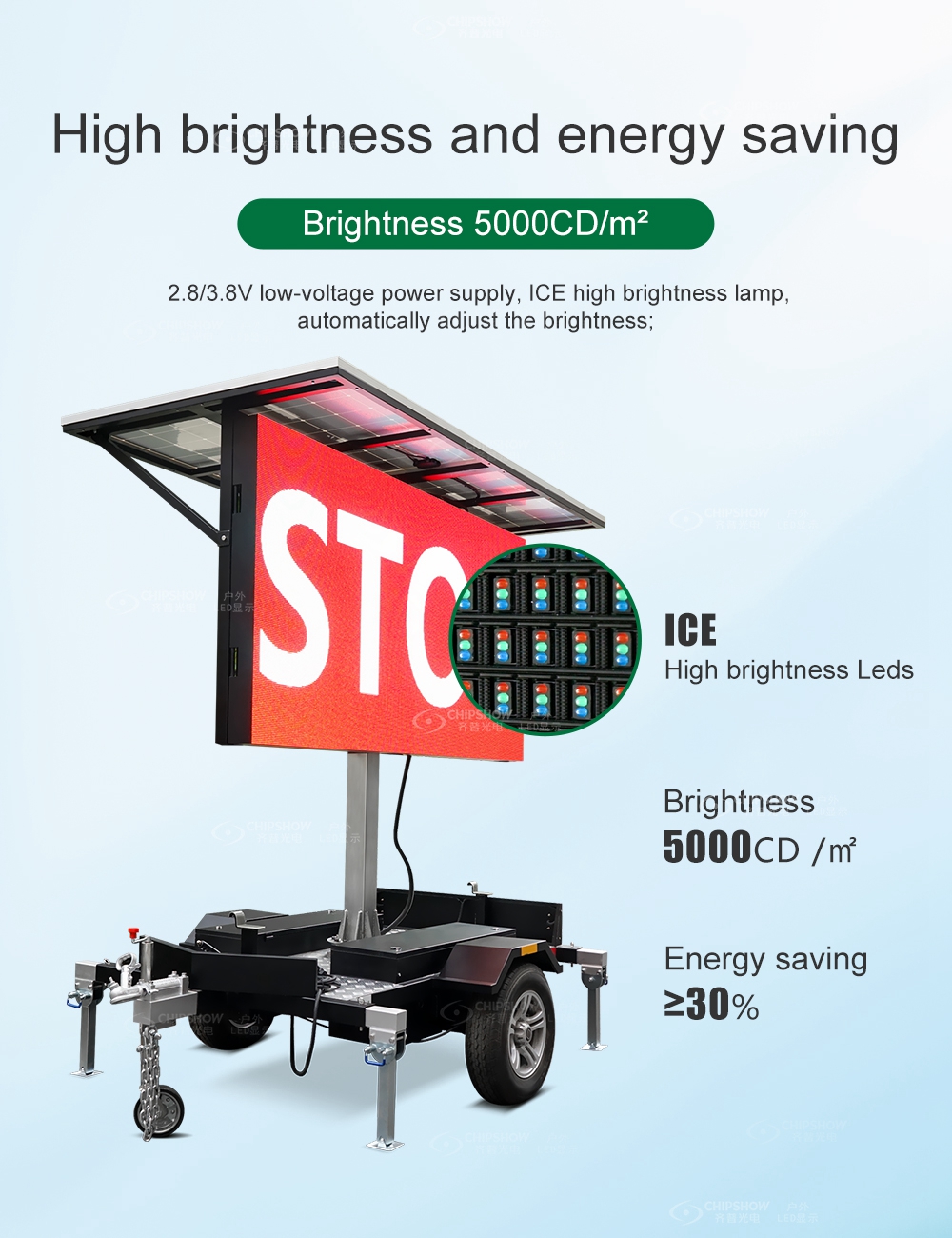 Солнечная зарядка + большая емкость 9,6 кВтч аккумулятор, который может непрерывно питать светодиодный дисплей 365 дней в году;