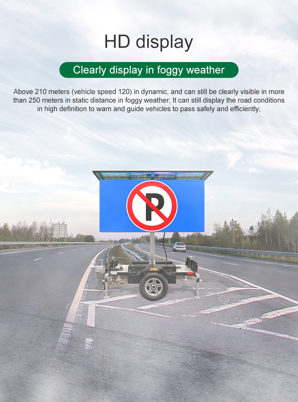 HD-дисплей: выше 210 метров (скорость автомобиля 120) в динамическом режиме, и его все еще можно четко увидеть на расстоянии более 250 метров. статическая дистанция в туманную погоду; Он по-прежнему может отображать дорожные условия в высокое разрешение для предупреждения и направления транспортных средств для безопасного и эффективного проезда;