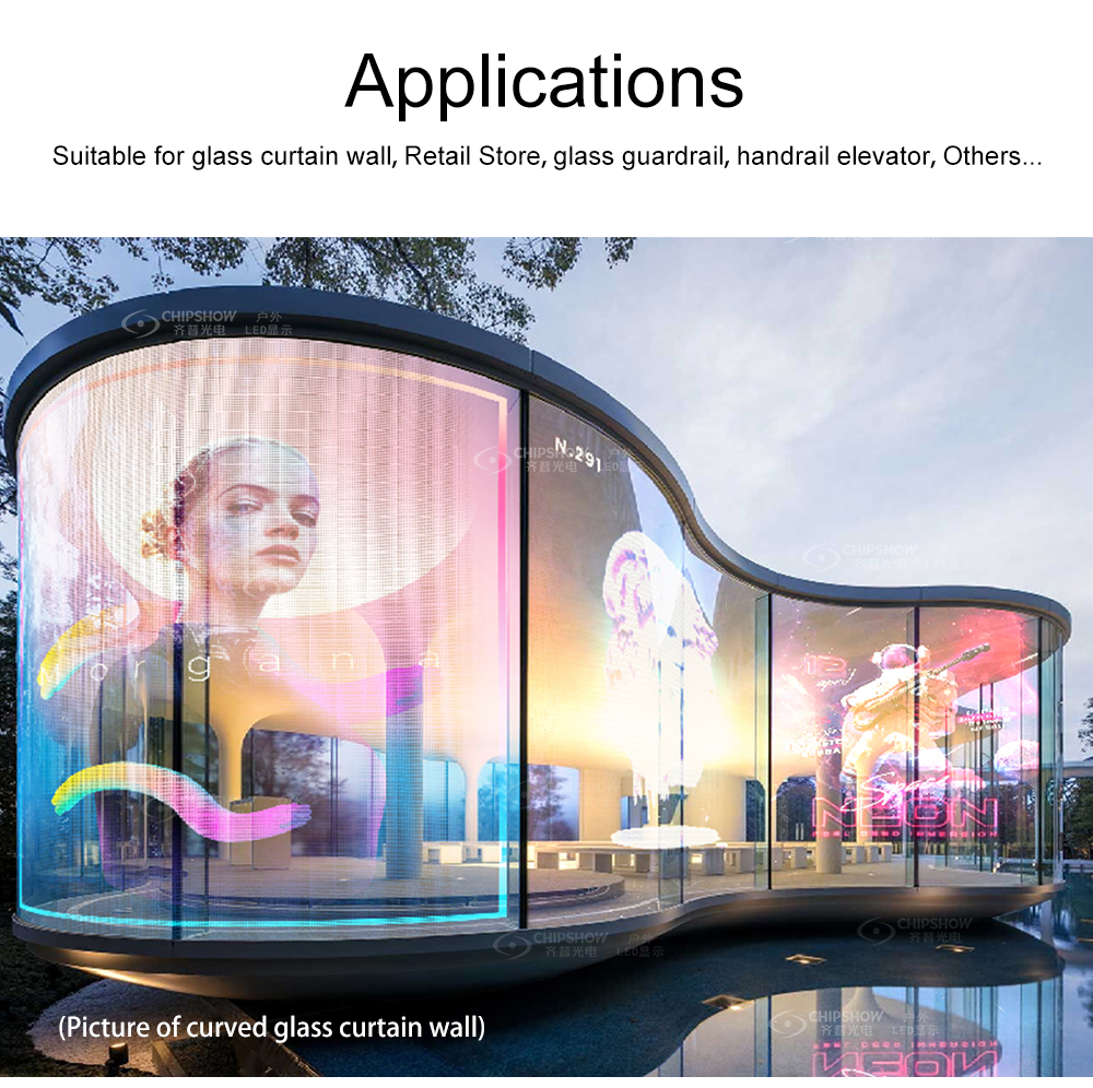 7 Широкое применение: светодиодные пленочные дисплеи очень распространены во внутренних торговых точках и широко используются для рекламы на прозрачных носителях, таких как стеклянные навесные стены, акриловые стены, стеклянные ограждения…