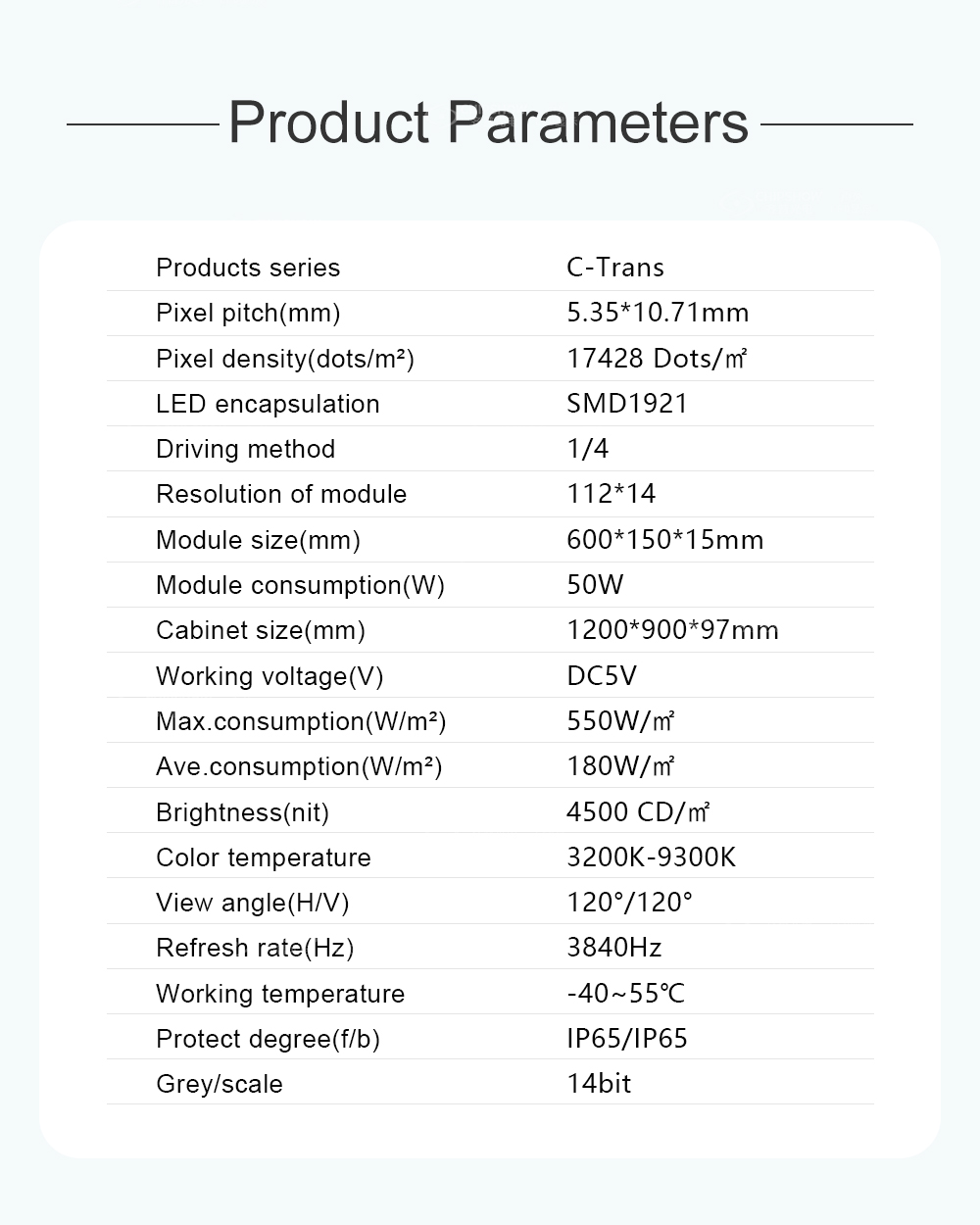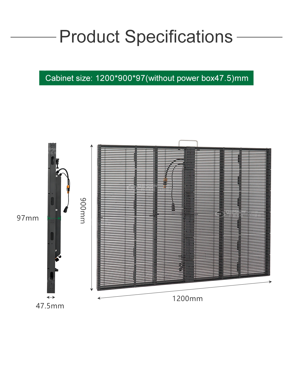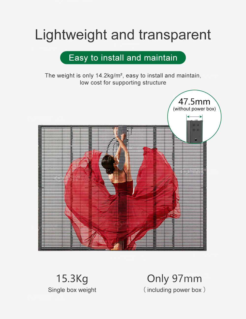 2 Высокая прозрачность: прозрачность экрана более 48%; при установке на стеклянную стену экран превращается в реалистичную видеостену; и вы по-прежнему можете видеть внешний вид через прозрачный светодиодный экран;