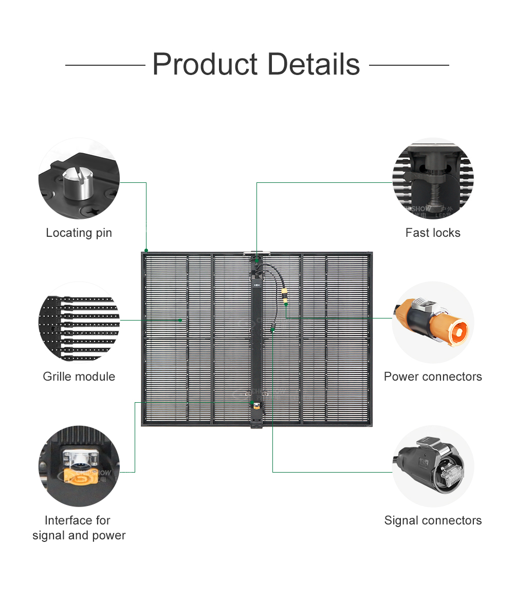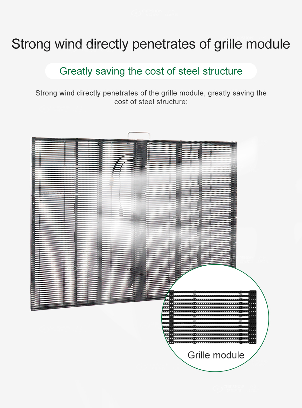4 Высокая вентиляция: светодиодные модули в форме сетки обеспечивают прямое проникновение ветра через зазоры между решетками; это сэкономит вам значительные затраты, которые должны были быть направлены на усиление стальной конструкции;