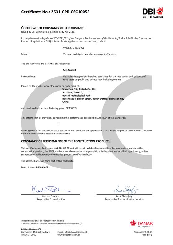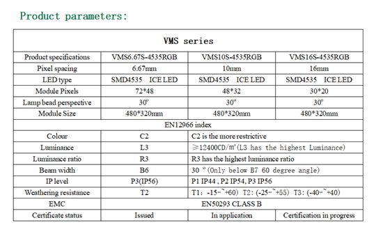 После многих дней испытаний и проверок модуль светодиодного дисплея «Chipshow VMS 6.67S - 4535RGB» прошел все детали и получил сертификацию европейского стандарта EN 12966. Этот европейский стандарт определяет визуальные и физические характеристики VMS, а также аспекты их долговечности. Он также содержит соответствующие требования и соответствующие методы испытаний, оценки и проверки постоянства характеристик (AVCP) и маркировки.