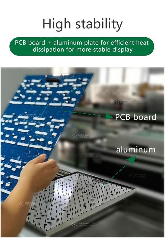 Chipshow уже более 20 лет специализируется на производстве светодиодных дисплеев и завоевал многолетнюю репутацию благодаря превосходному качеству. Chipshow использует высококачественные печатные платы на алюминиевых пластинах, что обеспечивает более стабильное и быстрое рассеивание тепла.