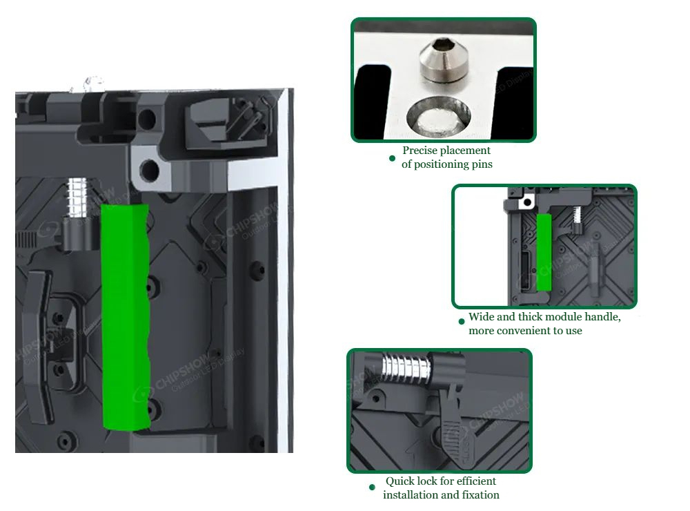 Магнитная конструкция : модуль магнитного всасывания C-Lite-Plus P1.56 можно обслуживать спереди и сзади, а магнитное всасывание между шкафами точно позиционировано и установлено, что делает арендуемую установку более экономичной и эффективной.