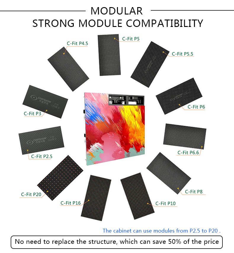 1) У нас есть шкафы с разрешением P2,5-P20, отвечающие различным требованиям клиентов. Стандартные модули, легко обновить.